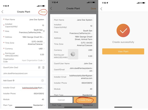 Toque "Crear Planta" para finalizar la creación de un sistema en SolisCloud. Toque "Ver Planta" una vez que le aparezca una marca de verificación grande.