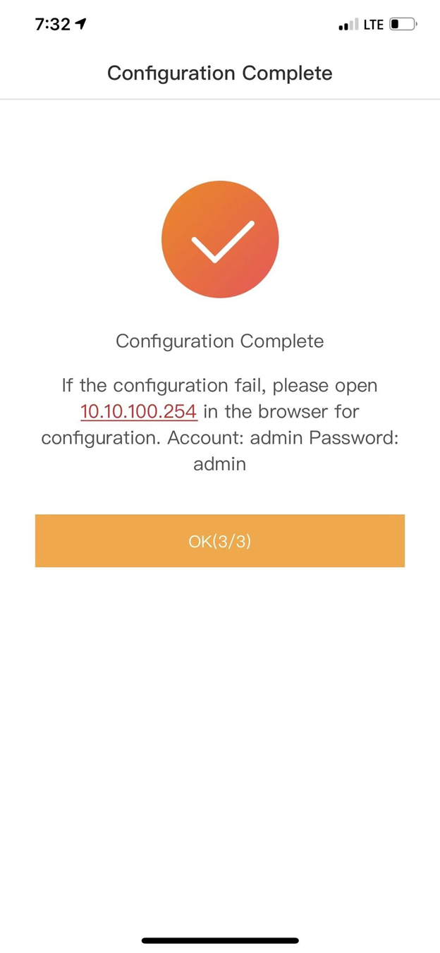 La siguiente pantalla debería decir "Configuración completada" y puede tocar "OK (3/3)" para finalizar la puesta en marcha.