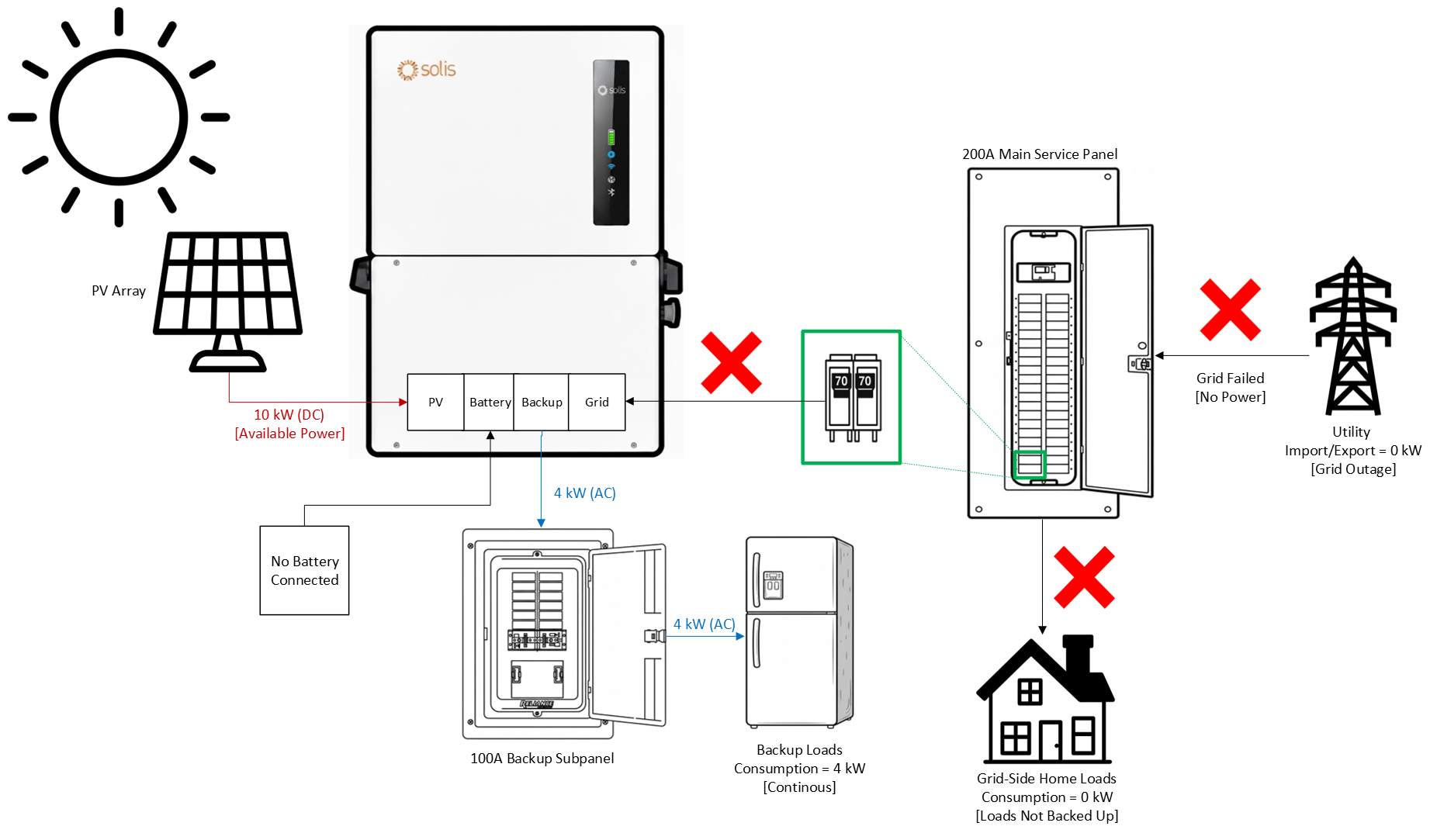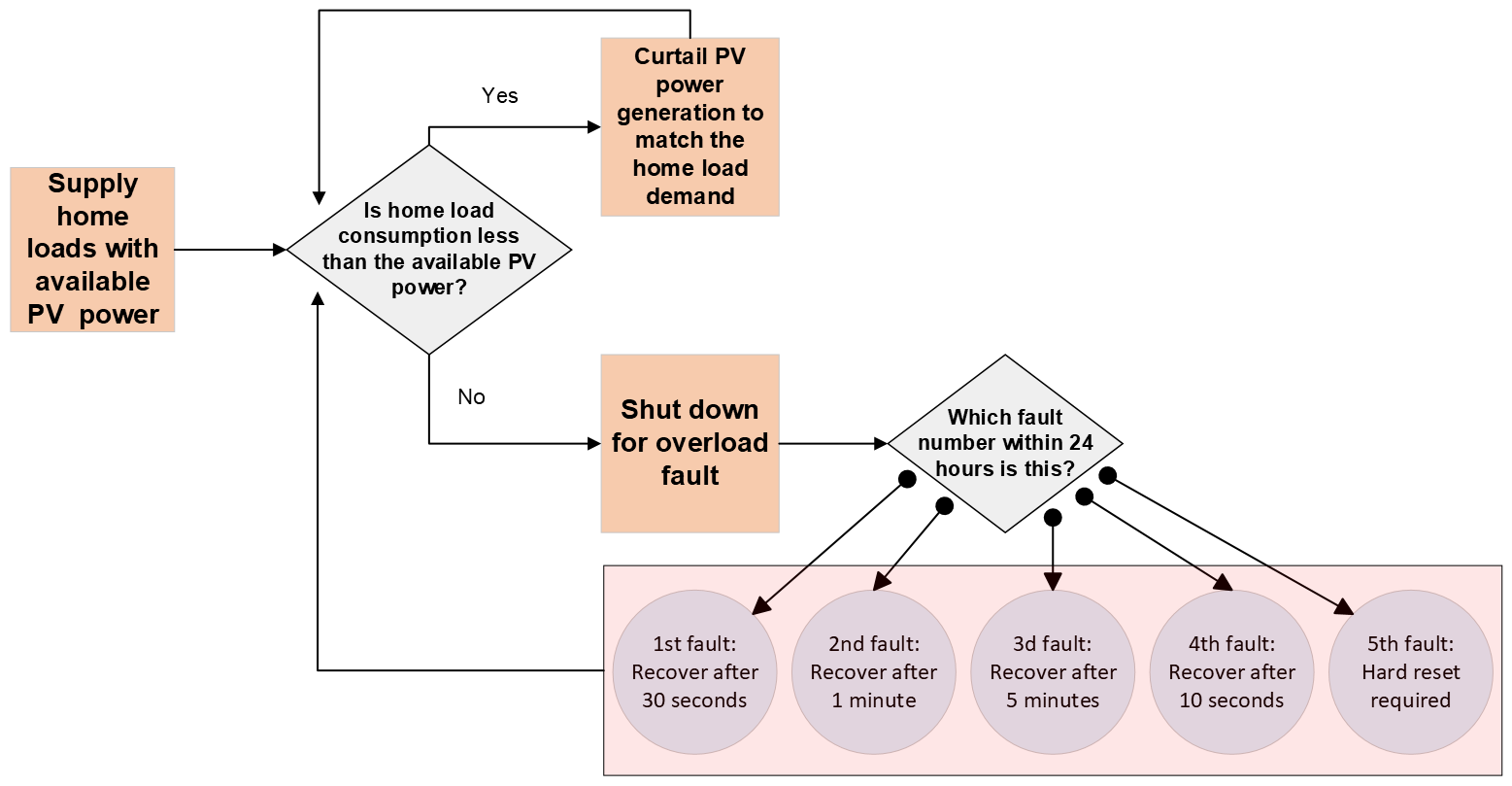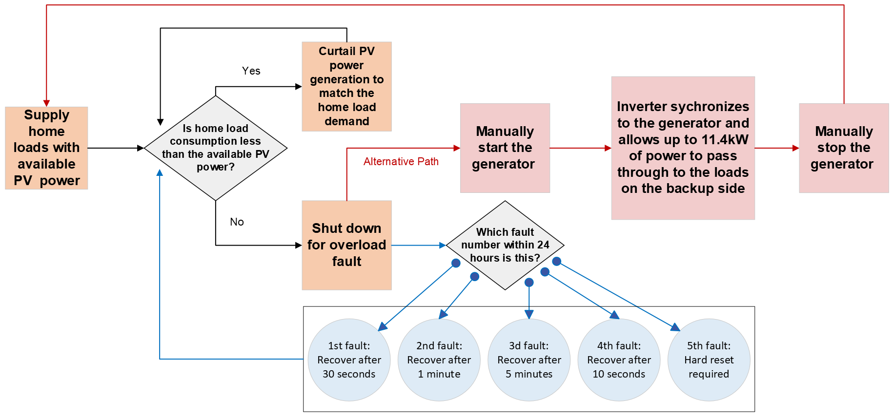 Because there is no energy storage, all backup power delivered to loads must come directly and instantaneously from available PV generation. Should the load consumption exceed the available PV power, the inverter will trip off disconnecting the home loads from power. This strictly enforces the ’temporary shutdown’ behavior mentioned in Section 4.4 of the User Manual.