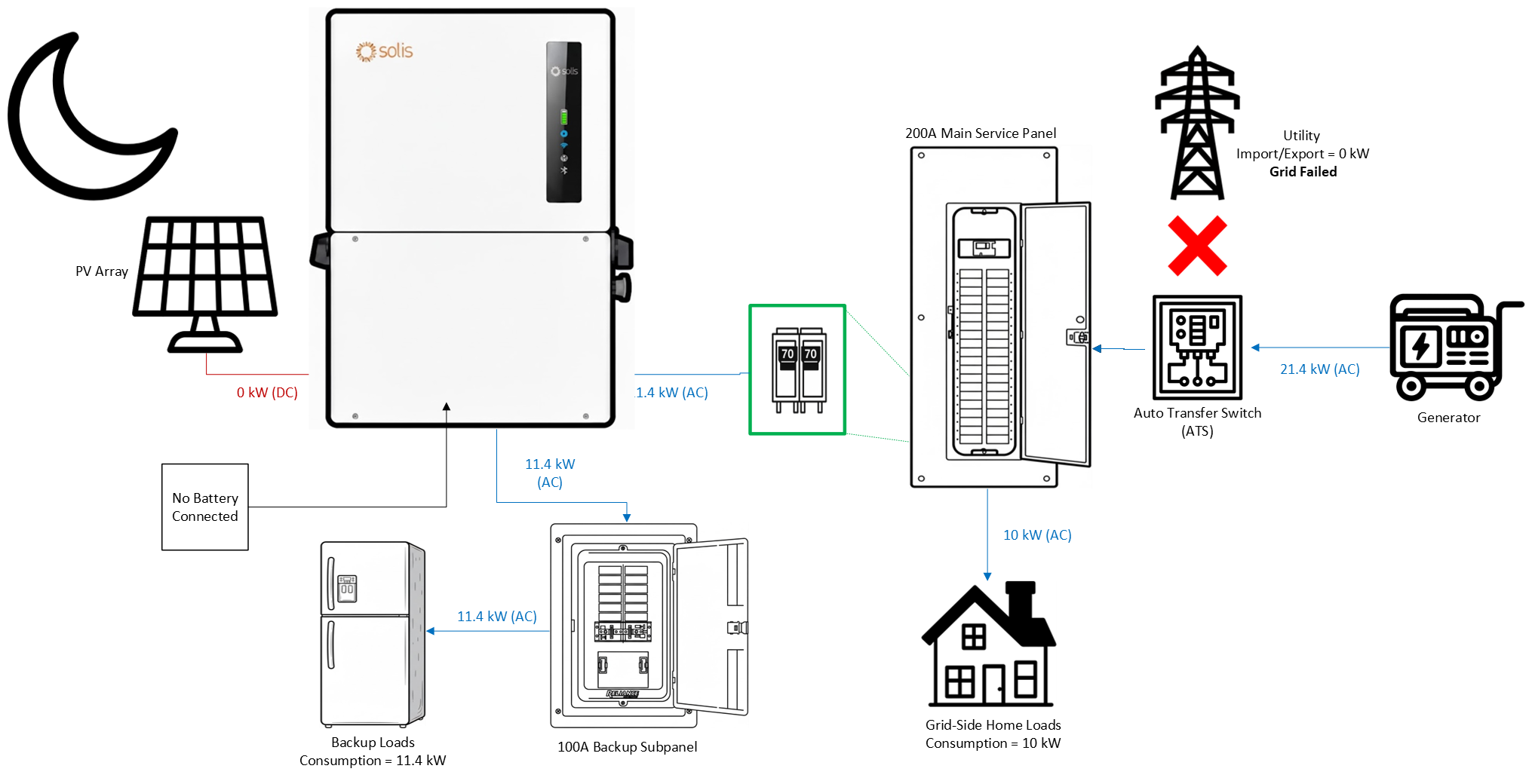 Note: The limit is 47.5A of continuous power that can be supported by passthrough power. If this is not enough, then loads should be left on the grid side of the system so that they can still be supported by the generator without that power passing through the inverter. The catch is those loads cannot be supported with PV-only backup and will be off until the generator is turned on.