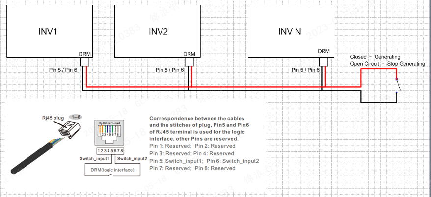 Step 5. After above wiring and setting configuration, using the Pin 5 and Pin 6 of the DRM port on the inverters can control the inverter to start to generate or shutdown.