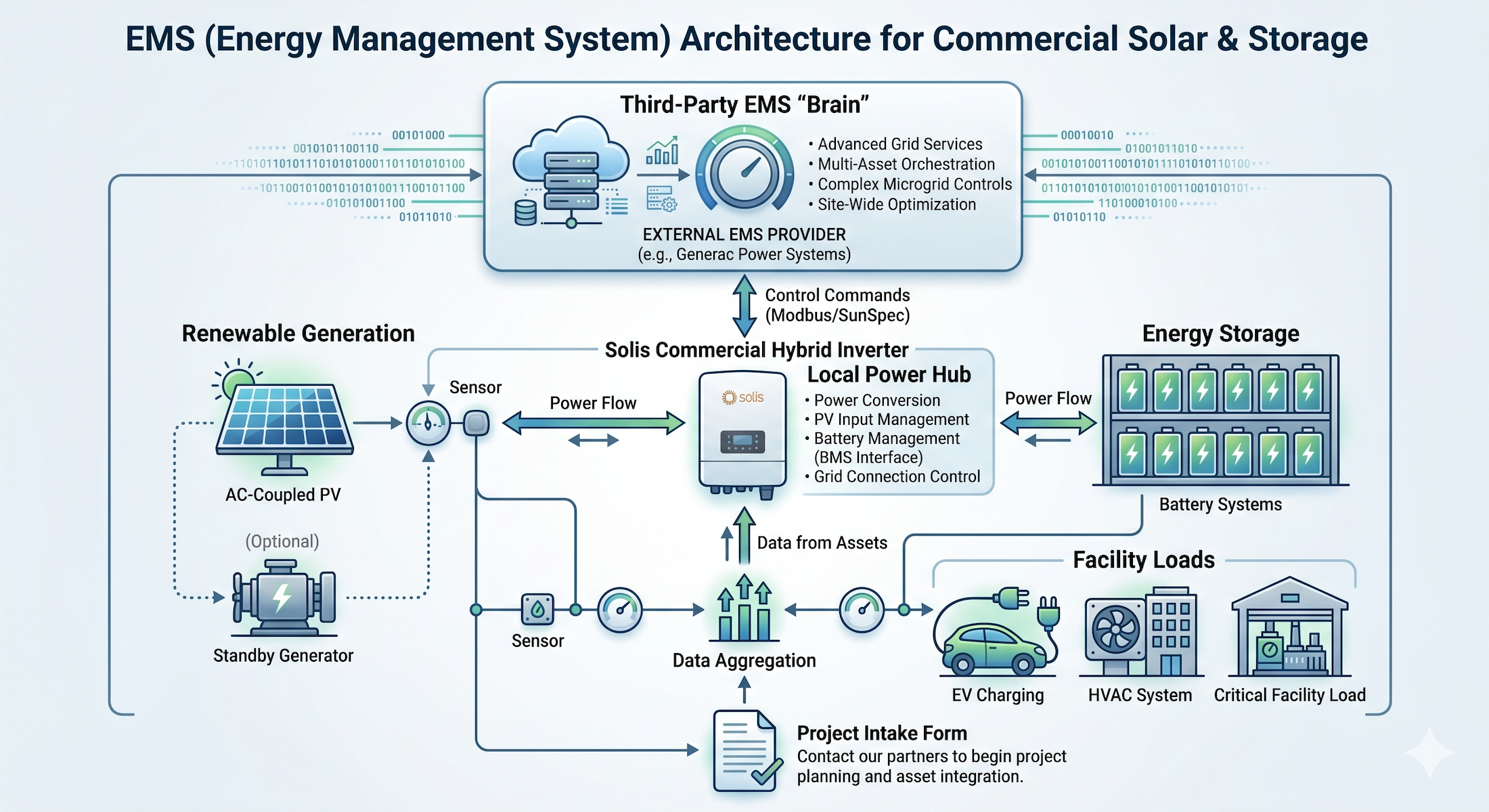 What Solis Handles Natively Solis commercial hybrid inverters come equipped with robust, built-in EMS capabilities designed to manage the core functions of solar-plus-storage sites. For many standard installations, the native intelligence of the Solis inverter is more than sufficient.